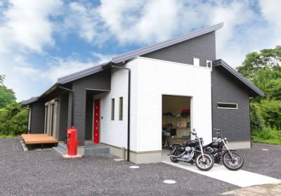 こちらは、オートバイをご趣味とするご夫婦の依頼に基づきプランニングされた家です。大切な愛車2台を収納できるビルドインガレージは必須条件。その上で、和の要素も取り入れた平屋として仕上げ、ダイニングにはフローリングと段差のないフラットな畳スペースも設置しました。またリビングと庭をつなぐウッドデッキも設け、休日にはお仲間を招いてのバーベキューに大活躍しているそうです。担当してくれた現場監督さんも、大工さんも、本当によくしてくれたとのことです。